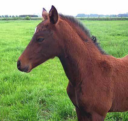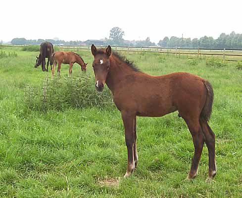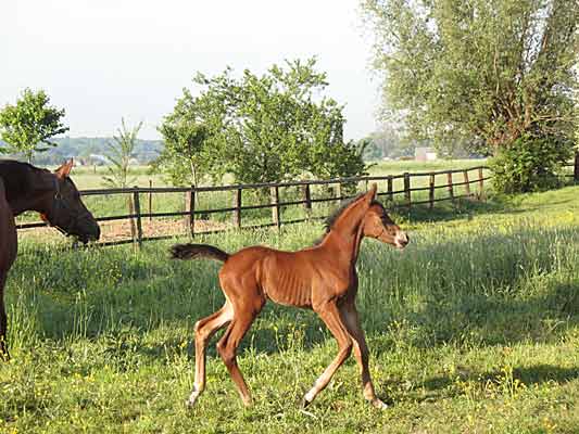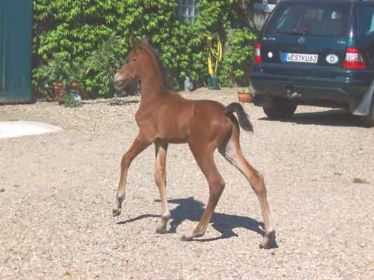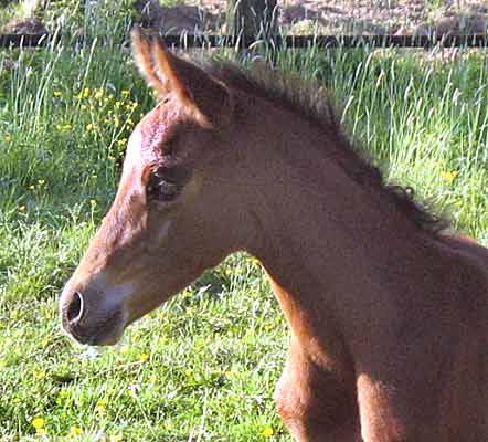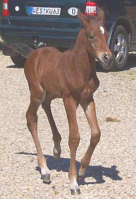Das Fohlen zeichnet sich unseres Erachtens aus durch eine gute Schulter und ein kräftiges Fundament sowie ein schon jetzt erkennbares, besonders menschenfreundliches Wesen. Seinem Vater verdankt es den Trakehner Typ, jedoch auch seine Mutter konnten wir in diesem Fohlen gut wiedererkennen. Die Fotos sind am 3.Juni entstanden.